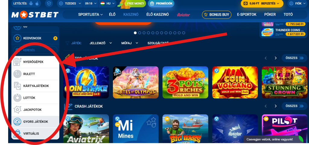 A Mostbet kaszinó 2025-ben az egyik legnagyobb játékválasztékkal rendelkező online platform Magyarországon. Több mint 3 000 különböző nyerőgép és asztali játék érhető el, amelyek között megtalálhatók a klasszikus slotok, a modern videónyerőgépek és a progresszív jackpot játékok. A Mostbet játékok között minden játékos megtalálja a saját stílusához illőt: legyen szó a rulett izgalmáról, a blackjack stratégiai mélységéről vagy az Aviator gyors dinamikájáról.